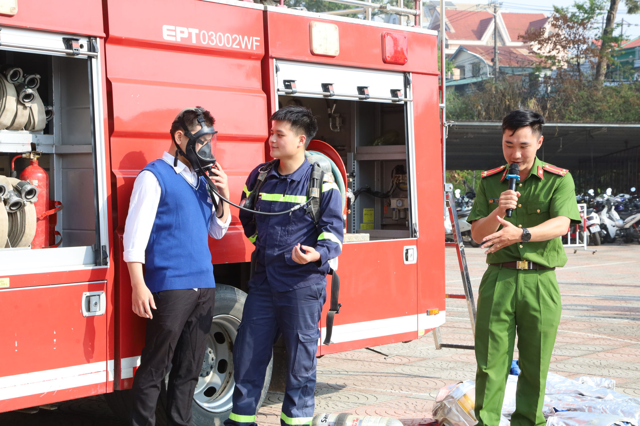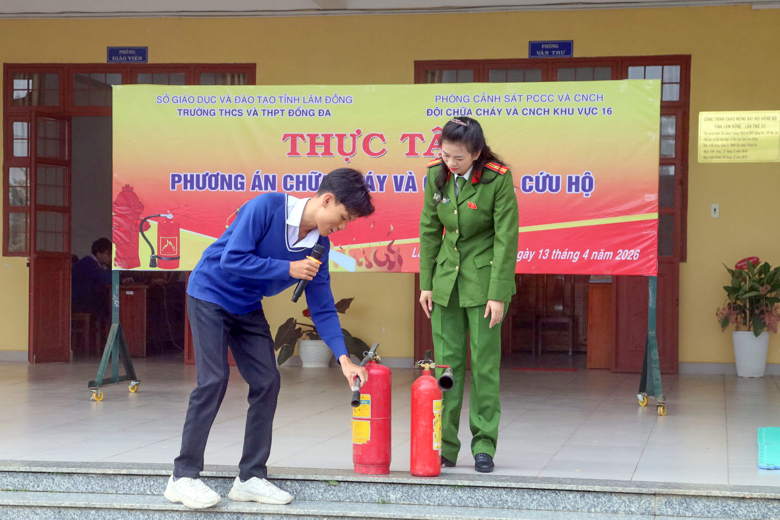 Giữa sân trường, các chiến sĩ thuộc Đội Chữa cháy và Cứu nạn, cứu hộ khu vực 16, Phòng Cảnh sát Phòng cháy, chữa cháy và Cứu nạn, cứu hộ, Công an tỉnh Lâm Đồng thực hành thao tác sử dụng bình chữa cháy, hướng dẫn cách thoát hiểm khi xảy ra sự cố. Từng động tác được làm mẫu chậm rãi, rõ ràng. Học sinh không chỉ đứng xem, mà còn được mời tham gia thực hành ngay tại chỗ.